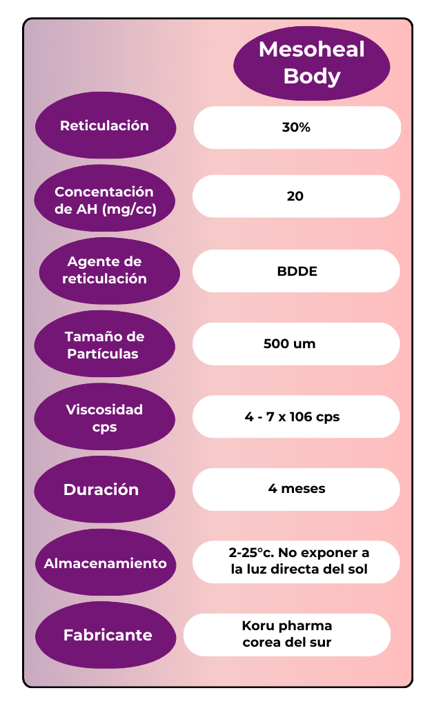 MESOHEAL BODY H.A por su alta viscocidad previene deformacion , crea volumen y prolonga su duracion.