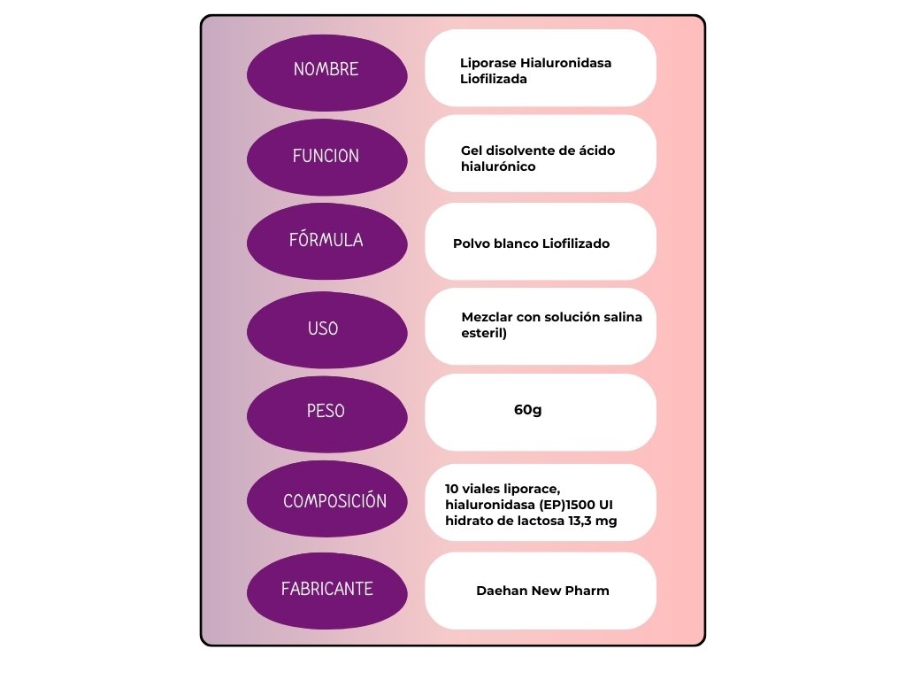 Producto cuya función principal es neutralizar el efecto del exceso de ácido hialurónico indeseado, mejorando la apariencia de la piel y potencializando los efectos de las inyecciones que disuelven la grasa.